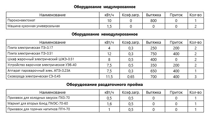 Здесь необходимо указать все единицы технологического оборудования, установленные в горячем цехе и на линии раздачи.